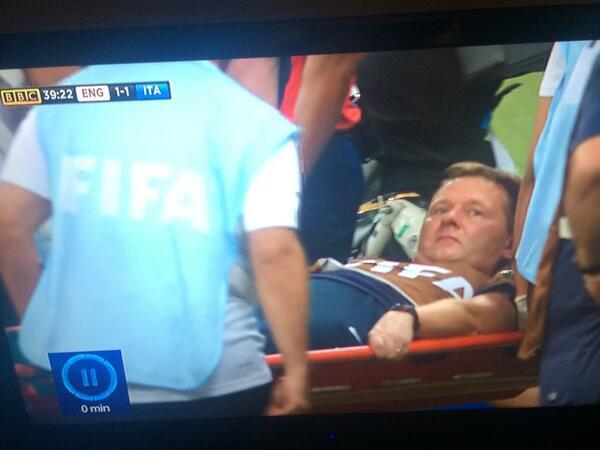 SkyFootball: England physio Gary Lewin is carried off on a stretcher. It appears he injured himself celebrating.